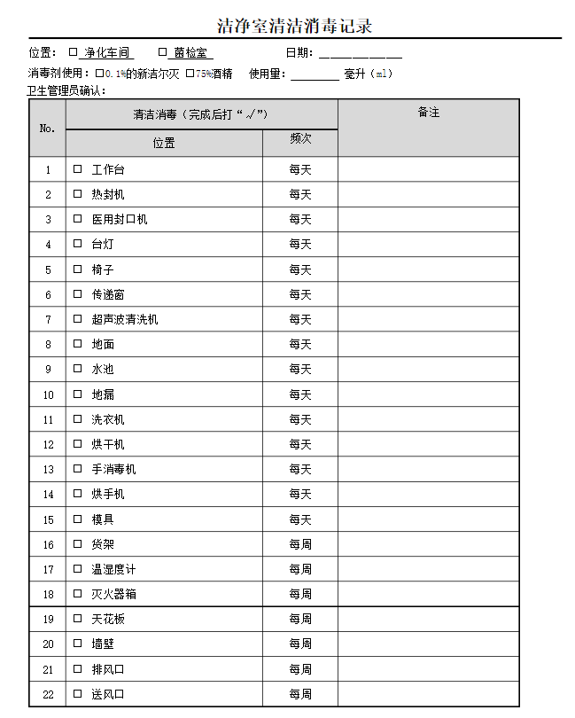 凈化車間需要有很多的表格,比如消毒、清潔等,每天都必須有人簽到以及主管部門確認,這樣才能保證干凈,洗手消毒記錄表怎么做呢?下面中凈環境來詳細分享做法。
